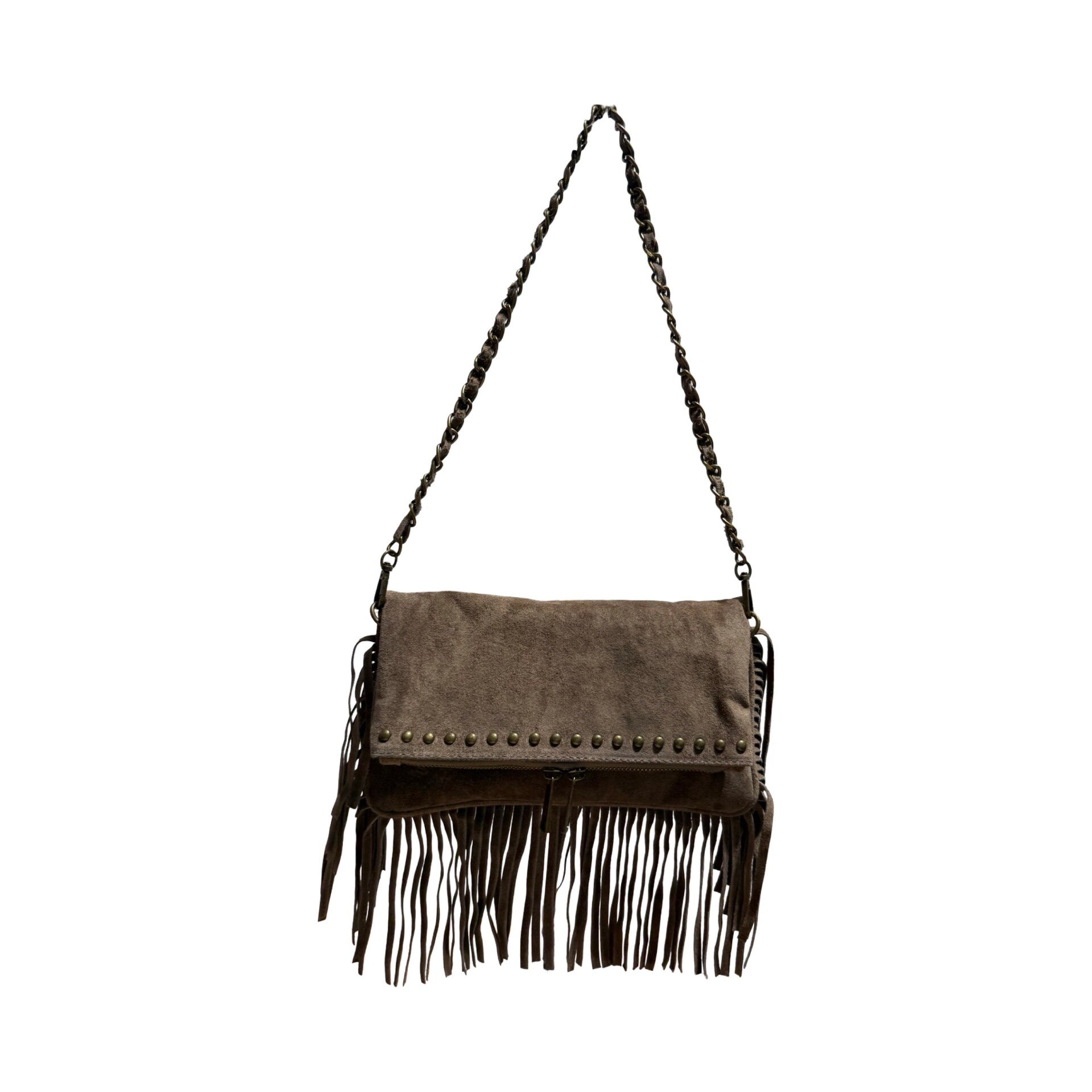 Handtasje met studs en franjes taupe